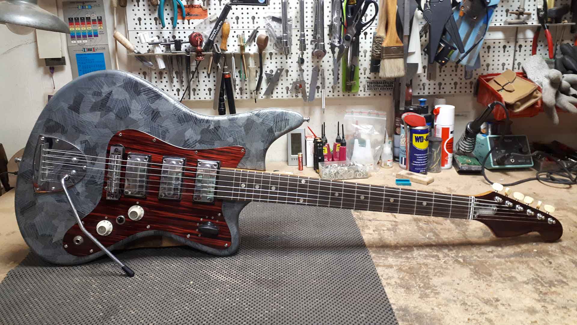 This guitar was also known as the Egmond Typhoon model. Following the 1st series named Electra, presented here in this article, with a 3 for the presence of 3 pickups, and, a V for the Vinyl finish, was only offered by Egmond in red or black with the new model name Typhoon.
